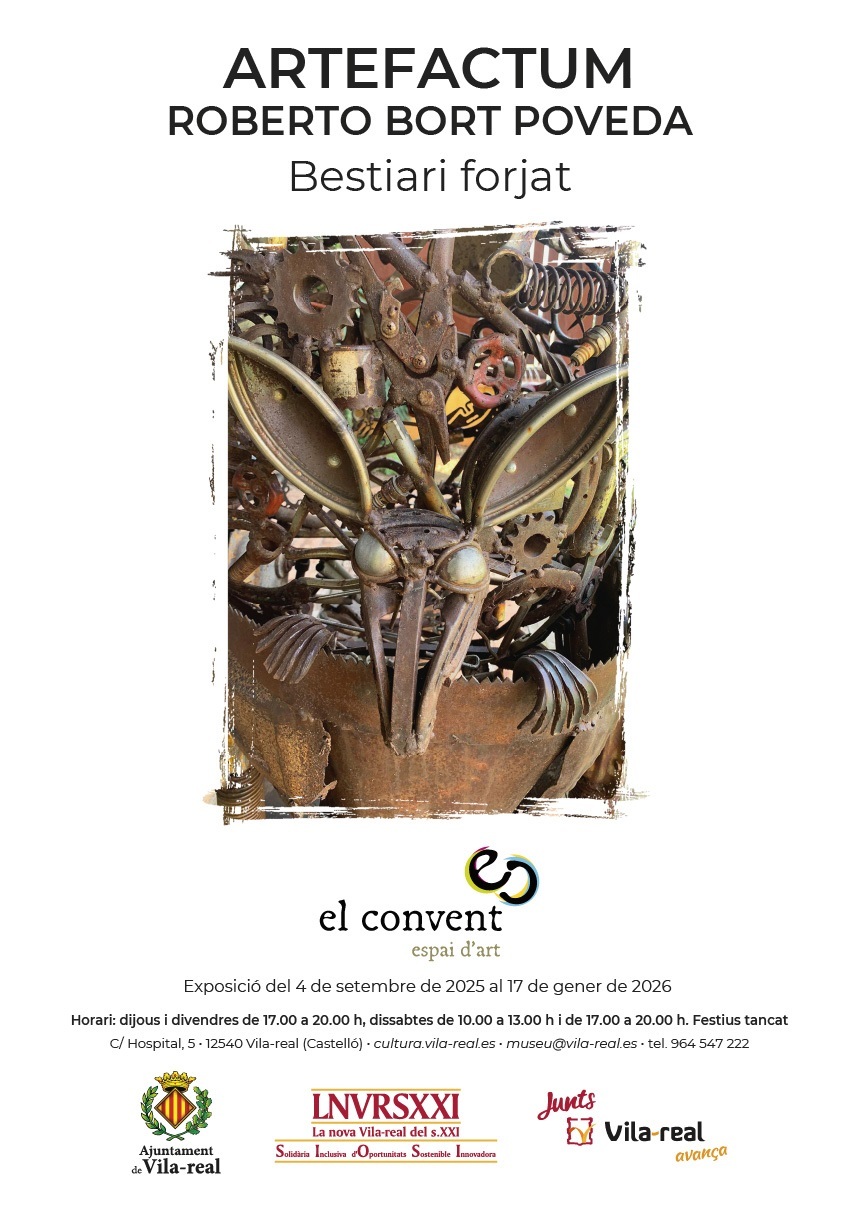 Del 4 de septiembre de 2025 al 17 de enero de 2026, se podrá visitar, en el Convent, espai d'art, la exposición "Bestiari forjat" del escultor vila-realense Roberto Bort Poveda, ArteFactum.