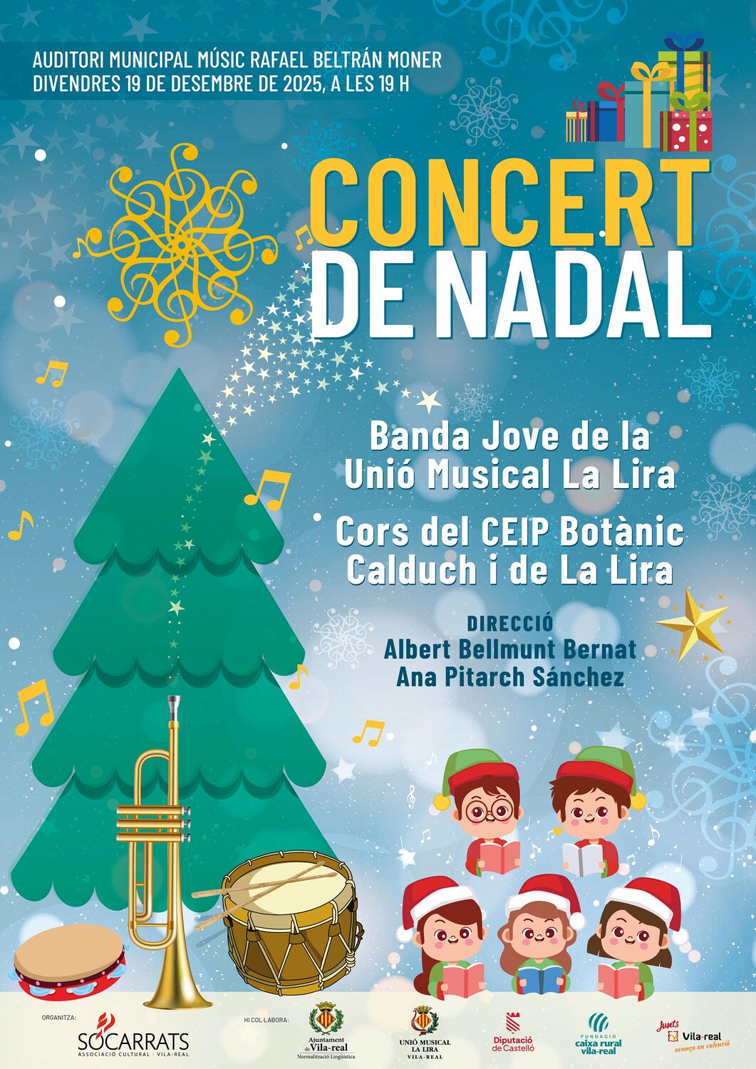 En la primera part, la Banda Jove interpretarà diverses peces d'autors amb molta relació amb Vila-real, com per exemple José Ramón Sancho, Rafael Beltrán o Francesc Tàrrega. En la segona part, s'hi afegiran les corals infantils del CEIP Botànic Calduch i La Lira per a interpretar diverses nadales, amb l'estrena d'una nadala de Borja Muñoz Abad.
