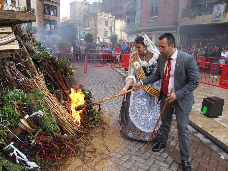 La tradicional ofrenda de flores, por parte de peñas, asociaciones, colegios y entidades de todo tipo, anunció ayer la llegada de este día de sant Pasqual. A pesar de la lluvia, las flores que la ciudad de Vila-real brinda a su patrón llegaron a la plaza y basílica de Sant Pasqual, en un desfile que cerraron la reina y las damas de las fiestas. Al final de la ofrenda, el alcalde de la ciudad, José Benlloch, junto con la reina de las fiestas, Lorena Traver, encendieron la hoguera que ilumina la víspera del día grande de las fiestas.
