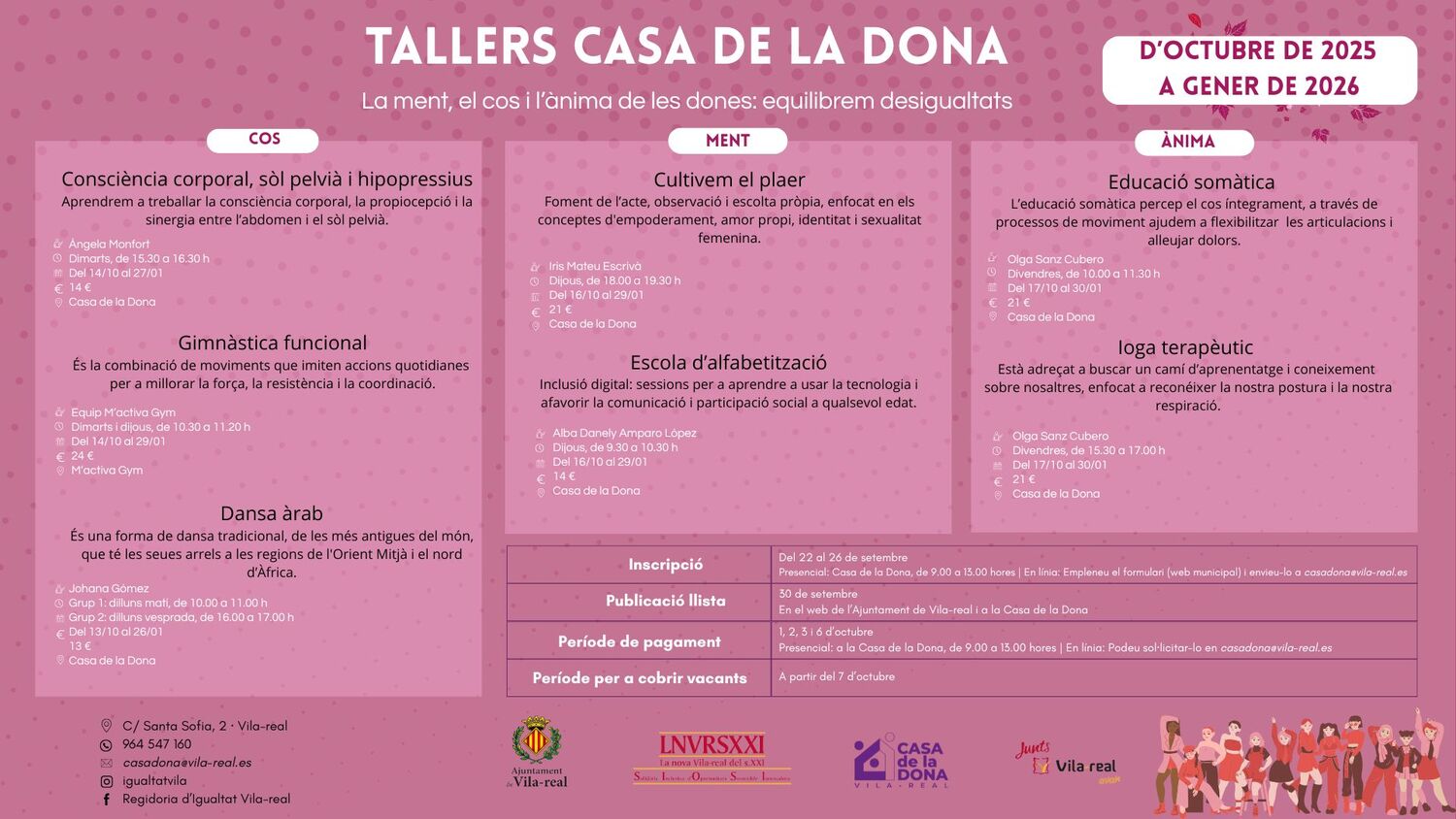 El periodo para presentar las solicitudes estará abierto del 22 al 26 de septiembre y pueden presentarse de forma presencial en la Casa de la Dona o de forma telemática, con el formulario que estará disponible en el apartado de Igualdad del web municipal. La publicación de la lista de admitidas se hará el 30 de septiembre. La matrícula y el pago se podrá realizar del 1 al 6 de octubre, también ambos inclusive. Si hay vacantes se ofrecerán a las personas en las listas de espera, desde el 7 de octubre; los talleres se iniciarán a partir del 13 de octubre y finalizarán el próximo enero.