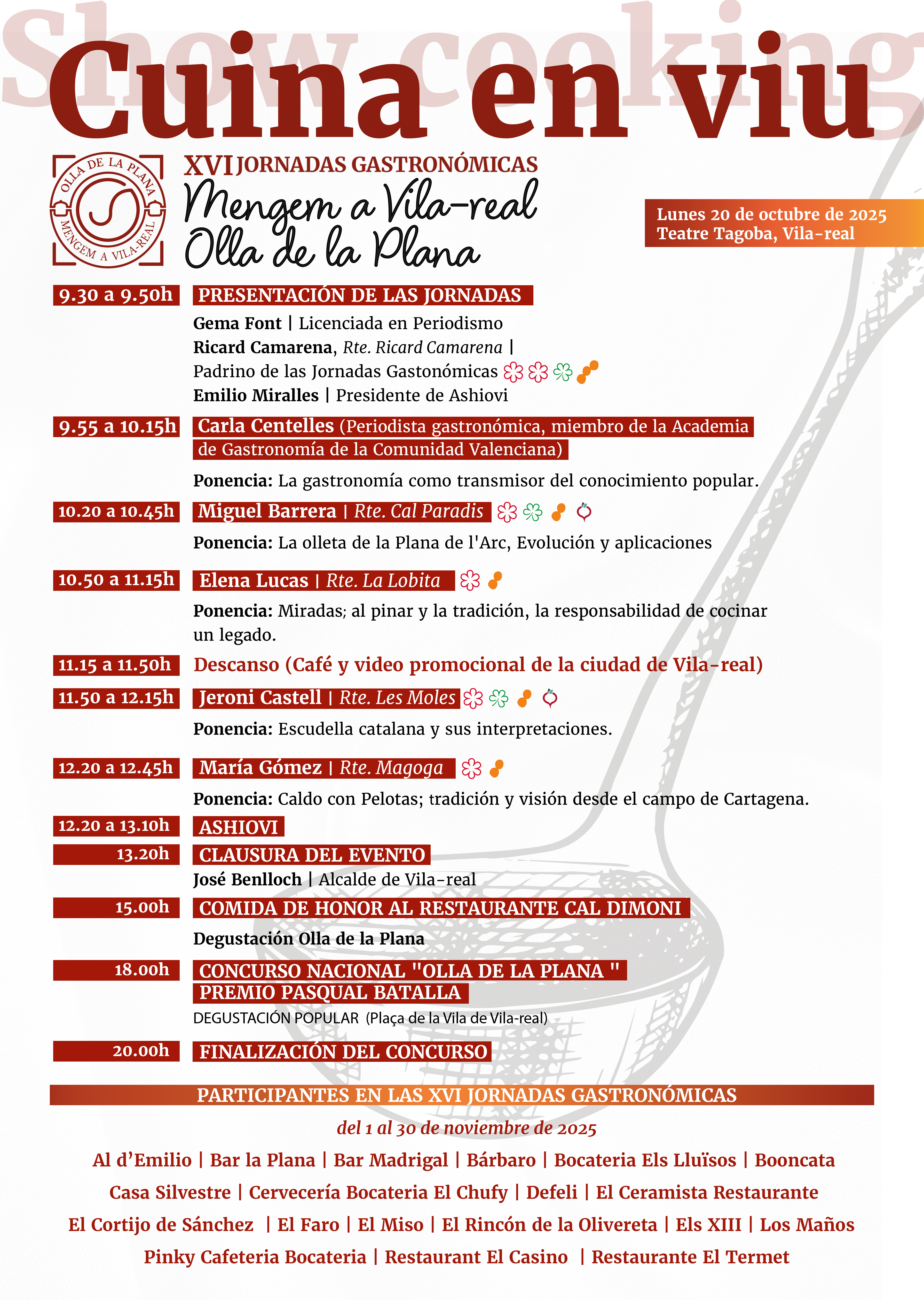 Un dels esdeveniments més esperats d'aquestes jornades és la realització del showcooking (cuina en viu) que comptarà amb la presència de diferents xefs amb estreles Michelin i que es durà a terme el dilluns 20 d'octubre a partir de les 9.30 h al Teatre Tagoba de Vila-real. Aquest acte estarà coordinat pel prestigiós xef Ricard Camarena (Restaurant Ricard Camarena, València), guardonat amb dues estreles Michelin, una estrela verda i tres sols Repsol, a més de ser reconegut com el 6é millor restaurant vegetal del món. Amb tot, el cartell de ponents suma altres 4 estreles Michelin, 8 sols Repsol, 2 estreles verdes Michelin i dues distincions We're smart amb la participació de Carla Centelles, periodista gastronòmica i CEO de Terrenae; Miguel Barrera (Cal Paradís, Vall d'Alba); Elena Lucas (La Lobita, Sòria); Jeroni Castell (Les Moles, Ulldecona) i María Gómez (Magoga, Cartagena). Les inscripcions per a assistir-hi són gratuïtes però amb aforament limitat, i poden realitzar-se enviant un correu electrònic a ashiovi@ashiovi.com.