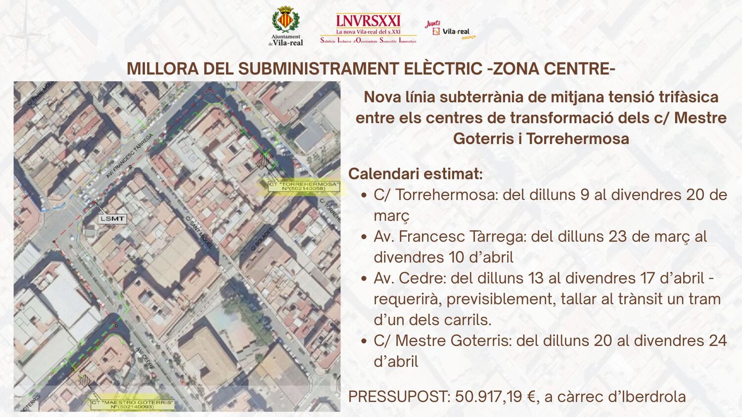 Aquesta actuació, que ascendeix a 50.917,19 € i sufraga completament lberdrola, forma part d'un conjunt de tres intervencions previstes a la zona centre de la ciutat que tenen com a objectiu modernitzar la xarxa elèctrica i reforçar la qualitat i fiabilitat del servei en una zona amb elevada activitat residencial i de serveis.