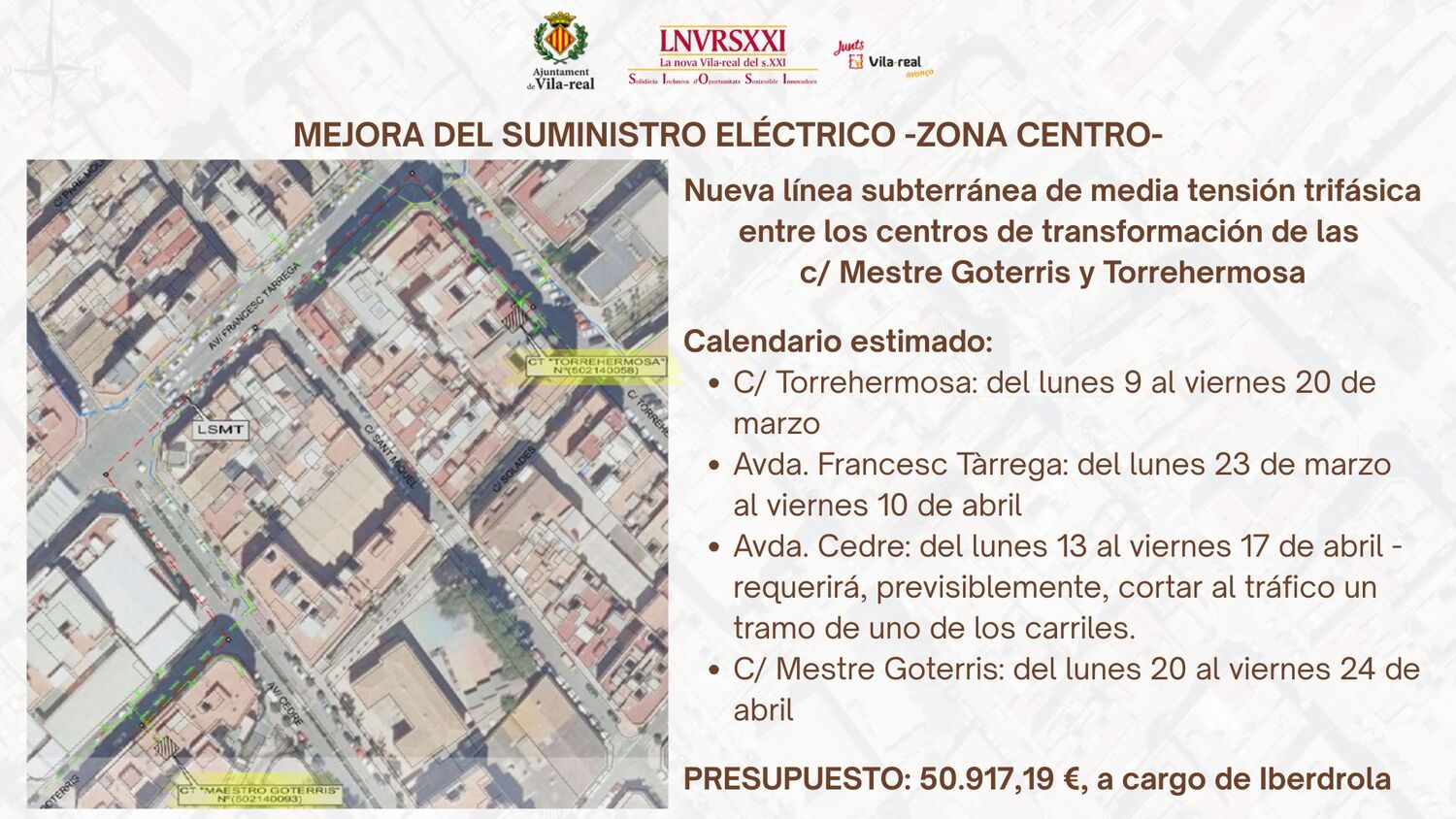 L'Ajuntament de Vila-real, a través de la Regidoria d'Urbanisme, continua avançant en la millora del subministrament elèctric de la ciutat amb la renovació de línies de mitjana tensió i infraestructures associades en la zona centre. El consistori ha concedit la llicència d'obres a l'empresa I-DE Redes Eléctricas Inteligentes SAU (Iberdrola) per a executar una nova línia subterrània de mitjana tensió trifàsica entre els centres de transformació dels carrers del Mestre Goterris i Torrehermosa "per a assegurar el servei a tota la zona des de dos punts en estar anellats amb un nou cablejat d'alumini, la qual cosa redueix els pics de tensió i els talls de llum", indiquen els serveis tècnics municipals.
