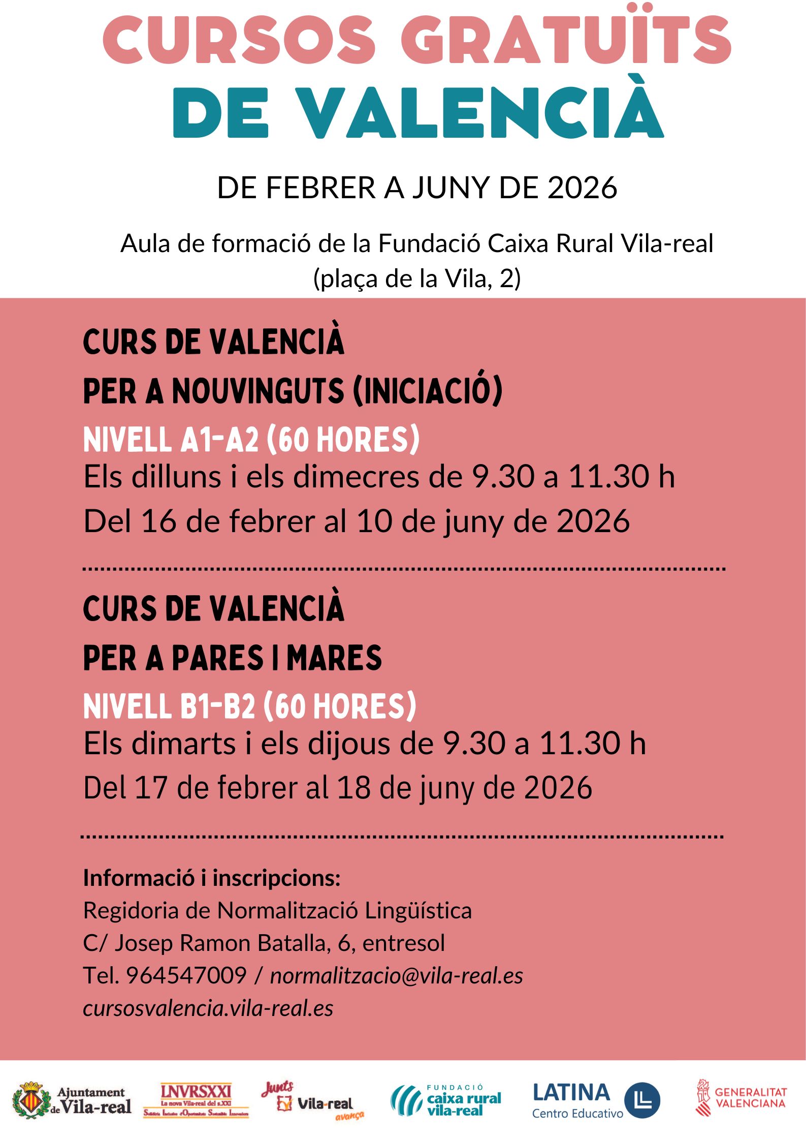 Si voleu aprendre valencià o perfeccionar els coneixements que ja teniu de la llengua, la Regidoria de Normalització Lingüística us ofereix cursos de valencià presencials i gratuïts adreçats a la població nouvinguda i al col·lectiu de pares i mares amb xiquets escolaritzats a Vila-real. També us oferim informació sobre altres entitats que organitzen cursos de valencià a la ciutat. I si voleu aprendre valencià des de casa, us presentem un seguit de recursos disponibles en línia per a l'autoaprenentatge.
