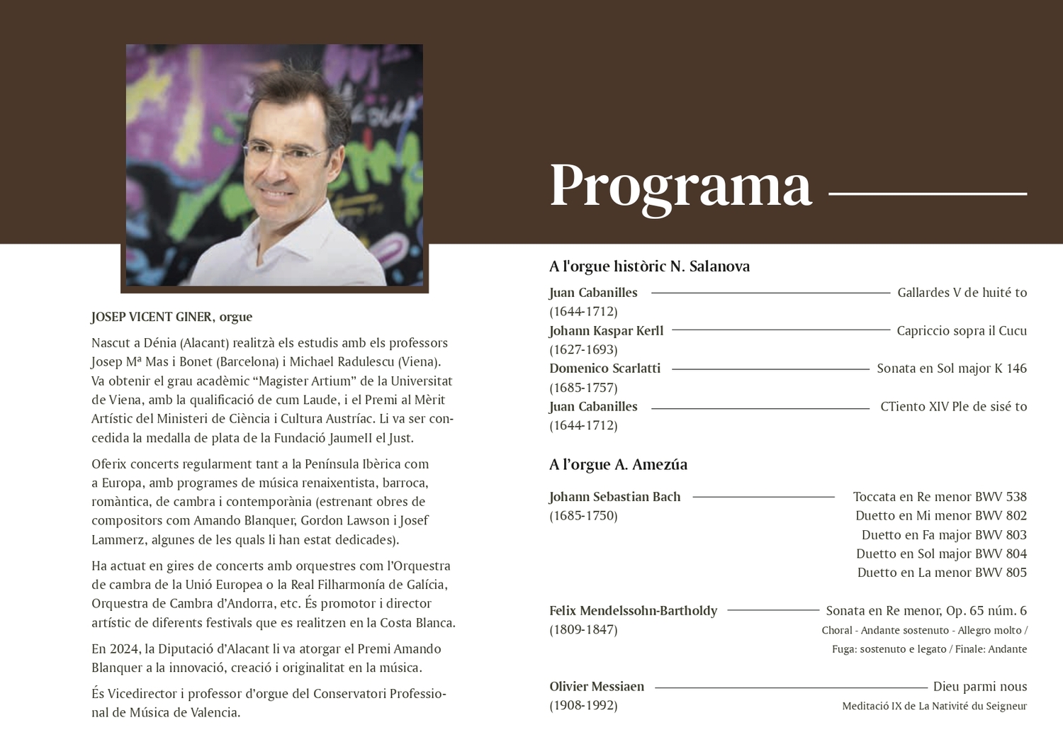Josep Vicent Giner, nascut a Dénia (Alacant), va estudiar amb Josep M. Mas i Bonet a Barcelona i Michael Radulescu a Viena, on va obtenir el títol de magister artium amb la qualificació de cum laude i el Premi al Mèrit Artístic del ministeri austríac. Ha rebut també la medalla de plata de la Fundació Jaume II el Just. Ofereix concerts a la península Ibèrica i Europa amb repertori de diferents èpoques i ha estrenat obres de diversos compositors contemporanis. Ha actuat amb diverses orquestres, dirigeix festivals a la Costa Blanca, va rebre el 2024 el Premi Amando Blanquer i és vicedirector i professor d'orgue al Conservatori Professional de Música de València.